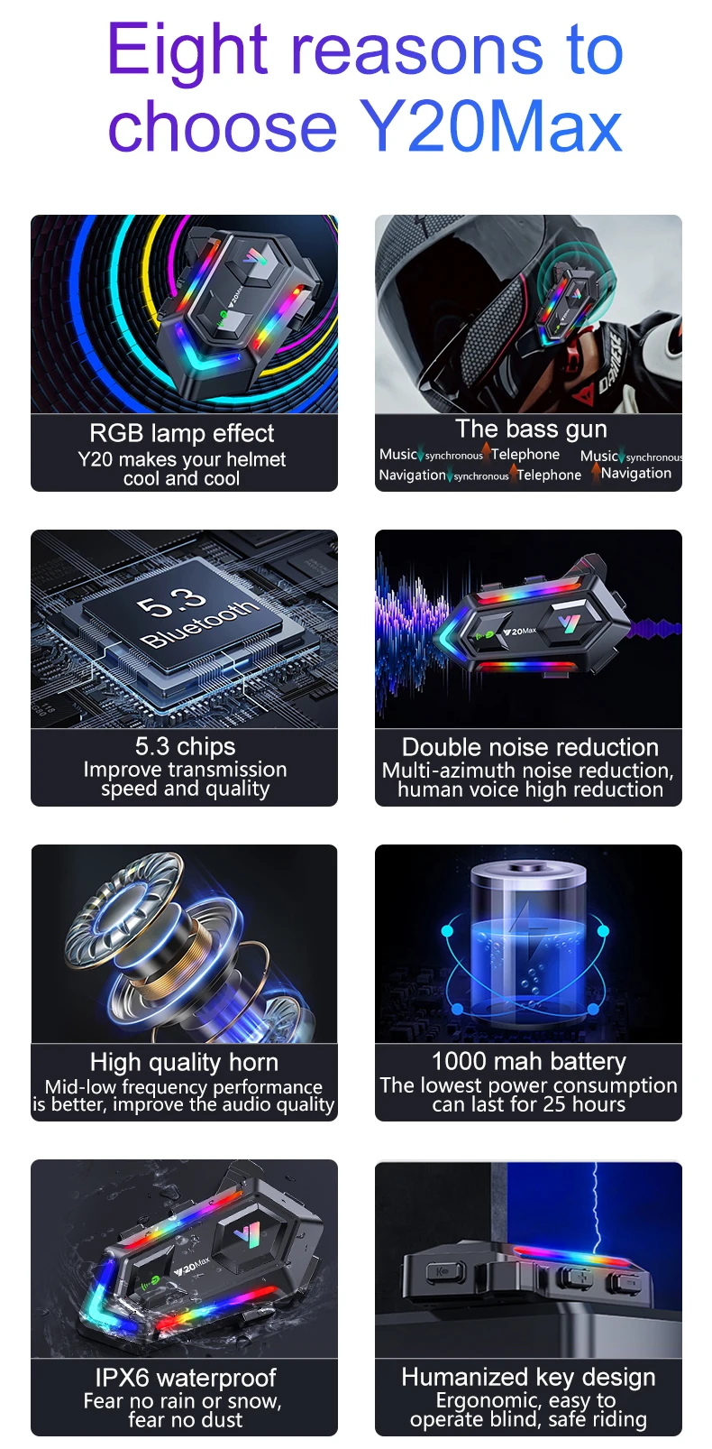 • Som de alta qualidade:Desfrute de som nítido e de alta qualidade com o headset Y20 MAX. Oferece áudio nítido, melhorando a sua comunicação e experiência musical durante o seu passeio.